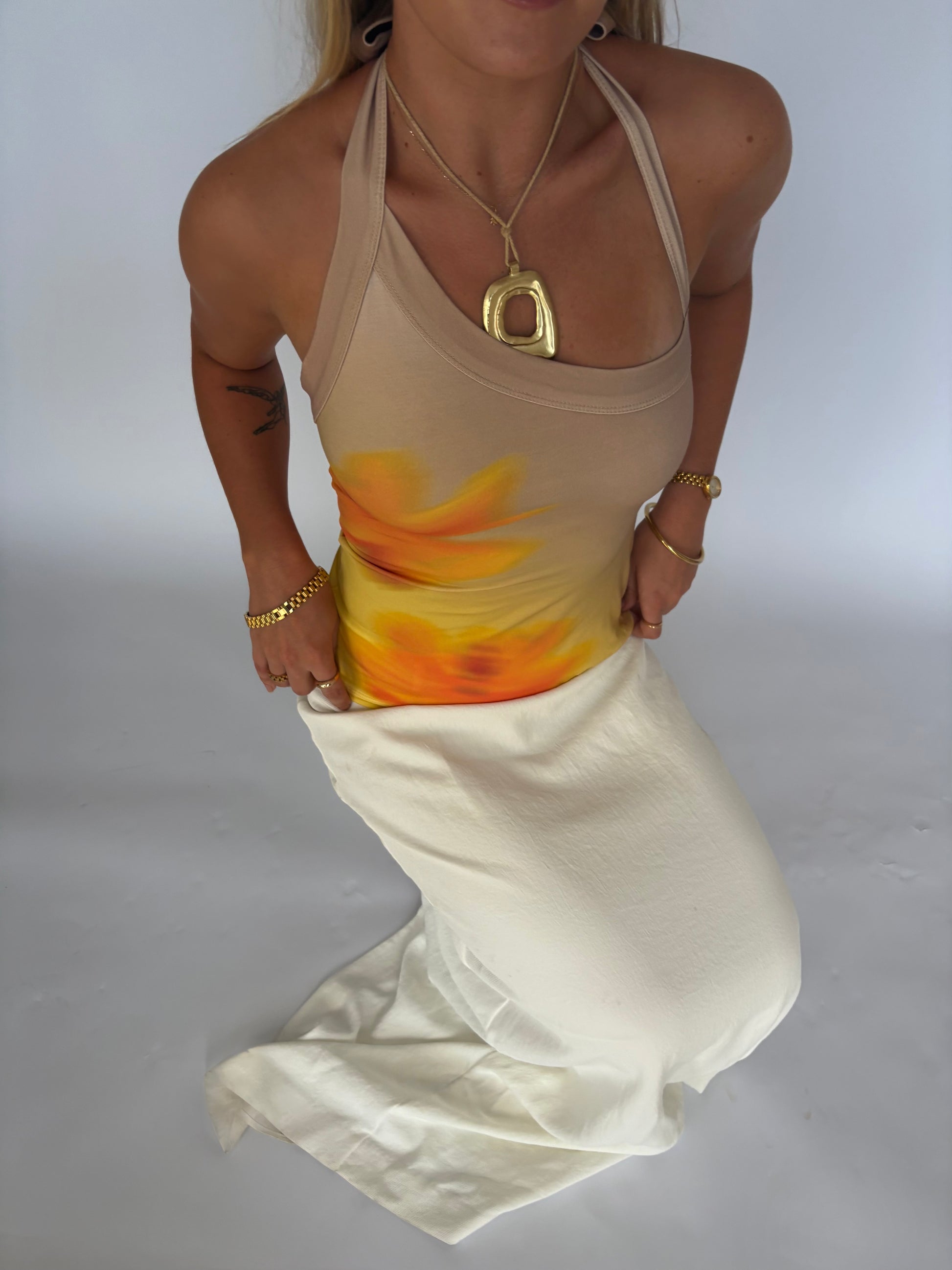 -Light brown into yellow ombré base with orange blurred flowers